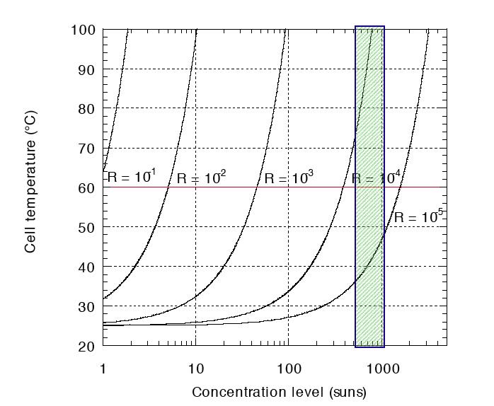 Research @ the Solar Energy GroupCooling of Concentrator Photovoltaic CellsThe cells are the most expensive part of a photovoltaic system. A simple way of reducing the system costs is therefore to replace some of the photovoltaic area with less expensive optics such as mirrors or lenses, which focus the sunlight onto a small area of cells. Because fewer cells are needed, one can afford to use cells of better quality, with higher efficiency. However, the photovoltaic cells only convert a small (below 30%) portion of the sunlight to electricity. The remaining photons are dissipated in the cells as heat. If this heat is not dissipated efficiently, it will result in a higher cell temperature, which in turn leads to a significant drop in efficiency. Silicon cells should generally be kept below 60C to avoid any long-term damage. Figure 1 shows how the cell temperature will rise for a range of concentrations if the dissipated heat is removed through the back of the cell with a cooling system characterized by its thermal resistance R [1].