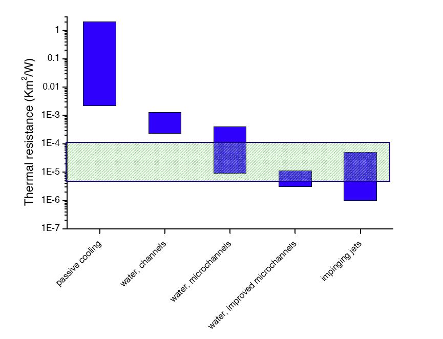 Figure 1: Cell temperature rise as a function of concentration level [1]. There are advantages and disadvantages both in the use of mirrors and lenses for concentrating sunlight. Lenses are associated with a relatively high optical loss, typically about 30%, due to reflection and absorption. The heat load is not a problem in lens systems because the cells are spread out on a plate, with plenty of space for each cell to dissipate the waste heat. With mirrors the typical losses are only 10-15%. However, because mirrors focus all of the light onto one highly illuminated area, the cells must be placed closely together in an array. All of the heat load must therefore be dissipated through the back of the cells, which makes cooling in these systems a challenge [1]. In fact, the efficient removal of this heat load is one of the major obstacles for creating viable mirror-based high concentration systems. There is a need for a cooling device that use a liquid coolant such as water, because air cooling is not efficient enough at higher concentrations, cools efficiently across the entire surface, while not shading the concentrator, and operates at a low pumping power. At the University of Sydney we are currently investigating the use of impinging jets in cooling devices for concentrator cells [2]. Basically speaking this means the water is forced out through an array of small holes and impinge onto the surface to be cooled. This method is used extensively for the cooling of gas turbines, thermal treatment of metals, cooling of internal combustion engines and thermal control of high power density electronic devices. By using this method one can achieve a very high heat transfer rate at a relatively low pumping power. Figure 2 shows a comparison of different cooling technologies available, where impinging jets are one of the most promising options [1].