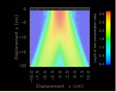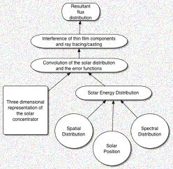 Research @ the Solar Energy GroupOptical ModellingThe key issues in designing homogenous fluxes in the absorber plane and understanding the thermal load on absorbers is to have an accurate representation of the solar flux impinging on the surface. At the University of Sydney we have created a modelling framework to simulate the flux distribution in dynamic abstract solar concentrators [1]. The model is designed to optimise the optics and hence designs of solar power systems. The model consists of a series of libraries (Figure 1) written in the computer language c++ with four main components: the PSA Algorithm [2] for calculating the solar vector, SPECTRAL2 [3] simulating the spectral energy distribution and two new computer codes that describe the spatial energy distribution of the solar image [4] and the broadening that occurs when a solar image is reflected off a non-ideal mirrored surface. The model uses the principle of ray tracing to recreate the flux distributions, and the results have a high correlation to observed data. By recreating the geometrical design of the optics in any concentrating system, including the systemic errors in tracking, surface and alignment, the solar energy distribution can be traced about the imaging plane to give an accurate representation of that flux. The model is a three-dimensional representation of the flux of which an example cross-section can be seen in Figure 2.