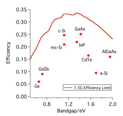 Figure 1. Limiting efficiency curve for a single band-gap solar cell under AM1.5 illumination. The points represent the best experimental single band-gap cells fabricated to date. A broad range of photovoltaic technologies are under investigation, spanning fundamental cell research to system performance under high concentration solar flux. Three broad experimental techniques are employed by the group: