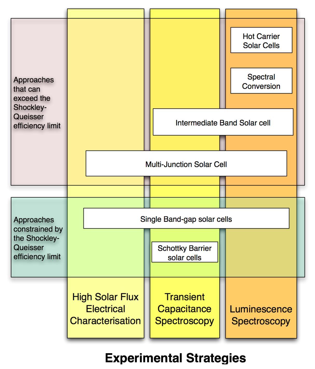 Research @ the Solar Energy GroupPhotovoltaics ResearchIn common with all heat engines, fundamental physical processes place a limit on the efficiency of photovoltaic devices. In a traditional solar cell, the limiting efficiency is usually a function of the band-gap of the absorbing material, giving rise to the "Shockley-Queisser" [1] efficiency limit shown as a curve in figure 1, the points represent the best experimental single band-gap cells fabricated to date. The photovoltaic activities in the School of Physics at Sydney University are mainly concerned with high-performance photovoltaic devices and systems, the majority of which aim to break the Shockley-Queisser efficiency limit.