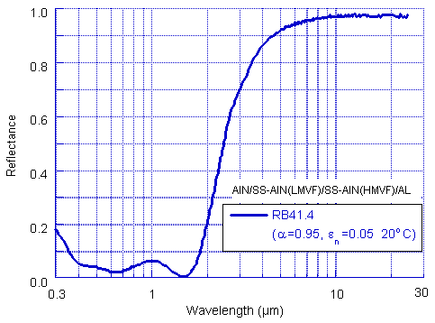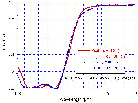 We have developed a computer modelling for design of solar selective coatings. As an example, a predicted normal reflectance spectrum of a Mo-Al2O3 cermet selective surface is shows in Fig. 2. The reflectance spectrum corresponds to a solar absorptance of 0.965 and normal emittance of 0.031 at 20°C. A near normal reflectance spectrum of a deposited film (dot points) is also shown in Fig. 2. This reflectance spectrum corresponds to a solar absorptance of 0.96, and near normal emittance of 0.03 at room temperature. Both calculated and deposited films have the same film structure, Al2O3/Mo-Al2O3(LMVF)/Mo-Al2O3(HMVF)/Cu.