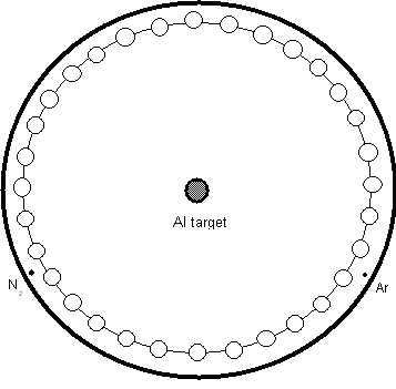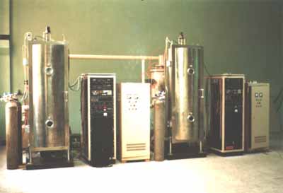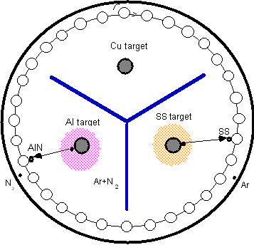 6. M-AlN cermet solar coatings by a novel two-target DC sputtering - Reducing the costs of high-temperature solar coatingsWe have invented a series of new cermet materials for solar selective coatings deposited by a novel two-target DC magnetron sputtering technology. The ceramic and metallic components in the cermet are simultaneously deposited by DC sputtering, running two metallic targets. Ceramic component is deposited by DC reactive sputtering and metallic component by DC non-reactive sputtering. A patent application describing these new solar selective coatings has been lodged. A series of metal-aluminium nitride (M-AlN) cermet solar coatings have been deposited using a planar magnetron sputter apparatus at the laboratory. An Al metal target is used to deposit AlN ceramic component in the cermet by DC reactive sputtering in a gas mixture of argon and nitrogen. Other metallic targets, including SS, W, Ni80Cr20 and Mo based alloy TZM, which have good nitriding resistance, are used to deposit the metallic component in the cermet by DC non-reactive sputtering in the same gas mixture. The solar absorptance of 0.94 - 0.96, and normal emittance of 0.03 - 0.05 at room temperature has been achieved for the deposited M-AlN cermet selective coatings with the double cermet layer structure. 7. Mass-produced double Al-N cermet layer solar collector tubesWe have made very successful commercial development of above two new innovations in collaboration with Peking University and Himin Solar Energy Company, China. Figure 3 (a photograph) shows two cylindrical DC magnetron sputter coaters, installed at a production line in China, for depositing Al-N cermet solar coatings onto batches of tubes. A cross-section schematic of the vacuum chamber is shown in Fig. 4.
