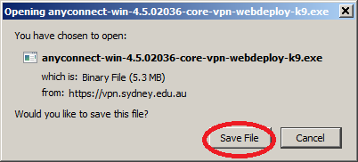 Once the installer download has completed. Click on the Firefox download icon and then click on the downloaded file anyconnect-win-4.5.02036-core-vpn-web-deploy-k9.exe to begin installation.