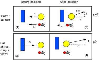 putter is approaching the ball at 5 m/s, as shown in diagram (3). After the collision, the bug sees the