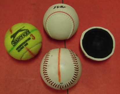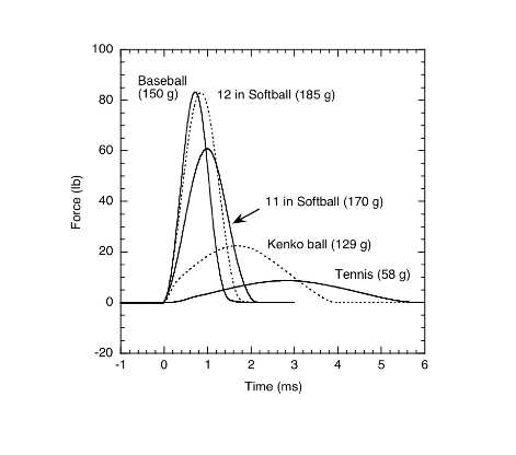 Kenko balls are soft, hollow, rubber balls used as official youth balls for baseball and softball in many countries around the world. The one in the photo is a ̉CÓ ball, weighing 129 g and has a wall thickness of 8 mm (4 mm of white rubber plus 4 mm of black rubber – hard to see in the half ball photo unless you move your head around to view from a different angle). Force vs time curves are shown when each ball is dropped 10 cm onto a hard surface. Impact duration increases with ball mass and decreases as ball stiffness increases. Impact force increases with both ball mass and ball stiffness (and also with ball speed).