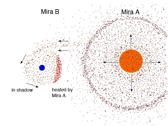 A schematic of the Mira system, showing the outer layers of Mira A being thrown off. About 1% of this material is captured by Mira B, forming a dusty disk. It is this disk that we have detected, illuminated by radiation from Mira A.