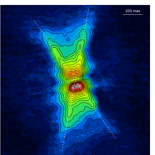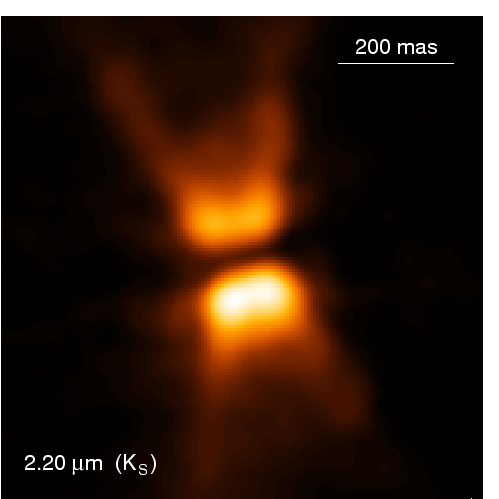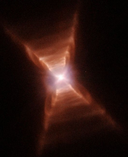 At this magnification, we can finally see a dark band crossing the center of the X. This is an orbiting disk of gas and dust at the core of the Red Rectangle. The disk has an opening at the top and the bottom (yes - yet another doughnut ) which funnels the gas flowing out from the star. This acts like a double-sided nozzle, funnelling material into the twin-conical outflows which give the characteristic hourglass appearance.